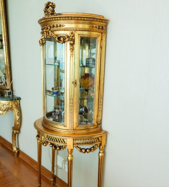 • Delicada vitrine estilo Luís XVI, executada em madeira entalhada e ricamente dourada. O corpo frontal apresenta vidros curvos e molduras trabalhadas com frisos perolados, folhas de louro e caneluras, elementos clássicos do repertório neoclássico francês. O topo é ornamentado por um coroamento de rosas e laços, sobre friso de folhas entrelaçadas. A faixa superior é decorada com festões florais suspensos, finalizados por rosetas e palmetas. A parte inferior da vitrine forma um pequeno aparador semicircular, sustentado por quatro pés longos e canelados, unidos por guirlandas florais em relevo. Ao centro destaca-se um medalhão circular com perfil neoclássico, ladeado por ornamentos vazados e guirlandas pendentes. O interior conta com prateleiras de vidro e fundo espelhado, conferindo luminosidade e realce às peças expostas. A douração apresenta pátina quente e desgaste artístico, preservando o caráter decorativo. Dimensões:1,80x0,75x0,40 metros.
