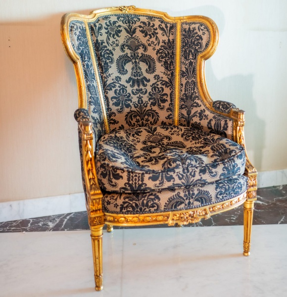 • Poltrona finamente trabalhada em estilo Luís XVI, com estrutura em madeira entalhada e acabamento em folha de ouro, preservando o brilho e a riqueza decorativa típicos do neoclassicismo francês. O encosto apresenta formato envolvente, com laterais levemente abertas e moldura contornada por frisos, rosetas e entalhes de folhas. O assento é largo e confortável, revestido em brocado de padrão damasco, em tom bege com desenho em preto, combinando textura, elegância e presença decorativa. Os braços são delimitados por entalhes florais e volutas, acompanhando o desenho do encosto. A peça repousa sobre quatro pés canelados, adornados com motivos vegetalistas, finalizando em pequenos pés torneados  elementos característicos do período Luís XVI.