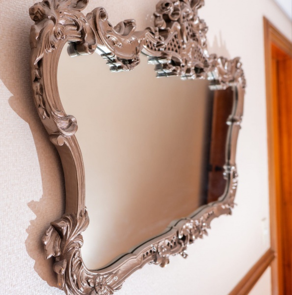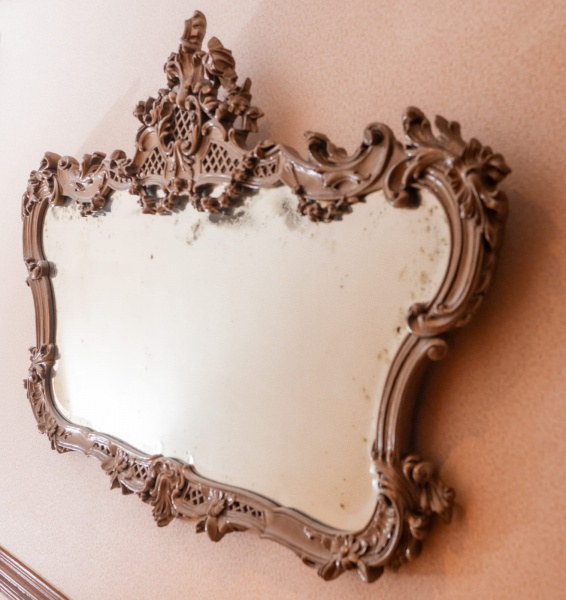 • Belíssimo espelho rococó, elaborado em madeira entalhada com rica composição de elementos florais, volutas, concheados e treliças decorativas. A moldura apresenta grande destaque ornamental, especialmente no coroamento, onde flores, folhagens e curvas assimétricas se entrelaçam em um trabalho de talha volumosa e detalhada. A superfície recebeu pátina na tonalidade chumbo, aplicada para realçar os relevos e conferir aspecto envelhecido e sofisticado, compatível com o estilo elegante do período. O espelho possui oxidação natural em vários pontos. A forma sinuosa da moldura, combinada aos entalhes exuberantes, reforça a estética rococó francês.