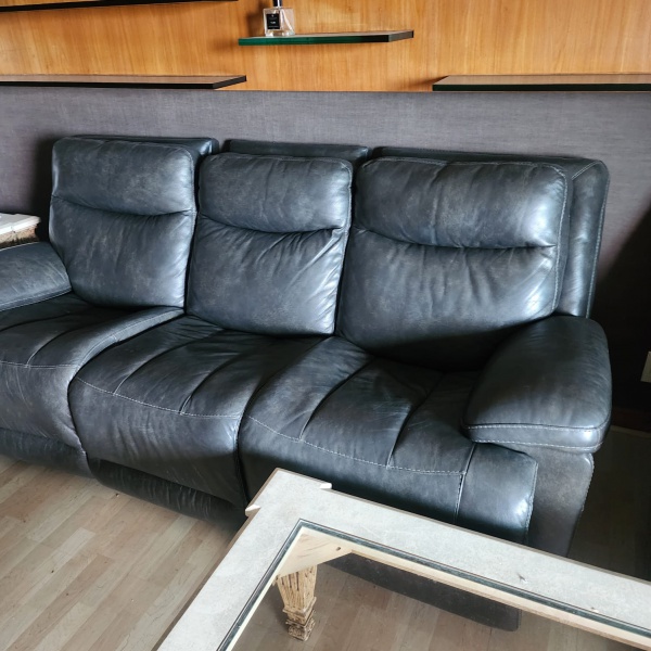 • Sofá de três lugares, confeccionado em couro natural preto, apresentando toque macio, alta resistência e elegância atemporal. O modelo possui mecanismos reclináveis individuais, permitindo inclinação confortável tanto do assento quanto do encosto. Estrutura sólida, braços largos e costuras reforçadas completam a estética robusta e contemporânea. O encosto alto e o estofamento abundante oferecem excelente ergonomia,
