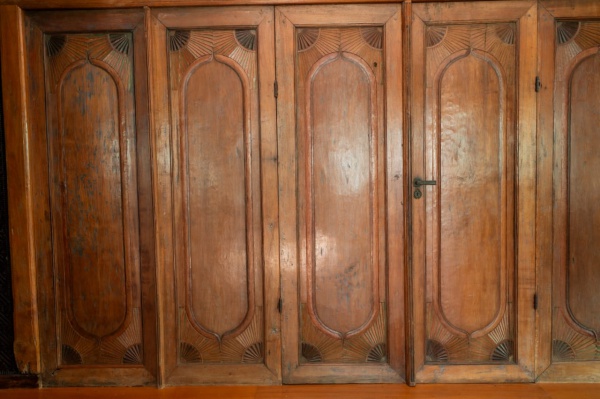 • Magnífico conjunto de portas antigas em madeira maciça, adquirido originalmente na cidade de Atlanta, Estados Unidos, e trazido ao Brasil como peça arquitetônica de destaque. Composto por seis folhas articuladas, apresenta excepcional trabalho artesanal em madeira de época, preservado com pátina original e desgaste coerente com sua antiguidade. A peça exibe entalhes executados à mão, combinando elementos florais, geométricos e arabescos em profundo relevo. A imponente faixa superior, esculpida em madeira escurecida, apresenta motivos foliares entrelaçados, com nuances esverdeadas da oxidação natural da pátina, reforçando seu caráter histórico. Cada folha possui painéis em arco ogival, moldurados e decorados com entalhes radiados (sunburst)  característica associada a marcenaria artística de alto padrão. O conjunto evidencia técnica refinada, proporções equilibradas e uma estética que dialoga com influências coloniais, orientais e artesanais do sul dos Estados Unidos. A madeira permanece com sua pátina original, apresentando marcas do tempo e pequenas irregularidades que atestam autenticidade e charme histórico. Trata-se de uma peça arquitetônica de grande presença. Dimensões: 4,35x2,35.