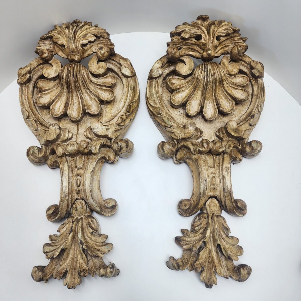 • Par de talhas em madeira maciça no estilo barroco, grandes apliques de inspiração Rococó/Rocaille, apresentando concha central em destaque, volutas sinuosas, rocalhas e folhas de acanto em alto-relevo. Ornamentação movimentada e fluida, típica do vocabulário decorativo do século XVIII.Acabamento encerada e patinada, com desgaste natural do tempo, revelando camadas antigas. Verso com antigas marcas de fixação, indicando provável uso como ornamentos arquitetônicos ou aplicações de mobiliário.Dimensões: 69x33x12 centímetros.