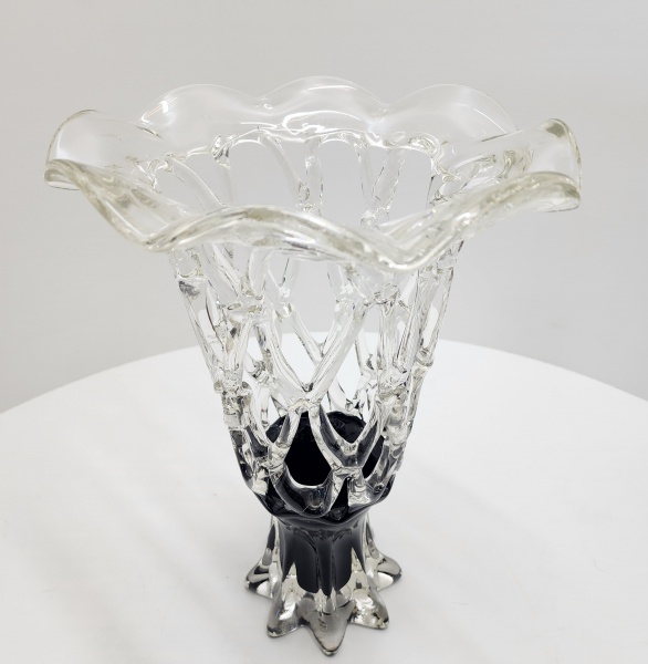 • Imponente vaso decorativo em vidro artístico soprado, executado com a técnica de gotejamento estirado (droplet-pulled) formando uma estrutura reticulada em forma de trama entrelaçada, típica do trabalho manual de estúdio. A peça apresenta corpo vazado em vidro totalmente transparente, com aplicação de vidro negro no pé  criando um contraste escultural marcante entre a leveza da parte superior e a base sólida, de linhas onduladas. dimensões:38x26 centímetros.