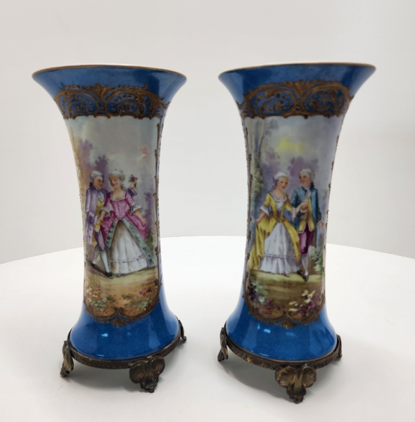 • Par de vasos em porcelana SÈVRES, ambos marcados na base, decorados com sena galante pintada à mão e fundo clássico bleu de Sèvres. As reservas ovais apresentam sena galante executada com paleta suave e acabamento minucioso, contornada por rica douração aplicada a pincel. O corpo dos vasos exibe esmalte azul profundo com ornamentação dourada em volutas e arabescos característicos da manufatura. As peças repousam sobre bases em bronze trabalhado, com pés em volutas e acabamento condizente com as montagens francesas tradicionais. Interior das bocas com pintura dourada e motivos florais. Vasos marcados SÈVRES, conjunto de grande elegância e forte presença decorativa. Dimensões:28x14 centímetros. ( um dos vasos está colado).