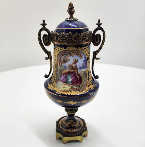 • Elegante urna decorativa em porcelana de Paris, França, século XIX, com tampa original e montagens em bronze dourado (ormolu).Peça em porcelana esmaltada no clássico bleu roi (azul-real), ricamente ornamentada com douração aplicada a pincel, apresentando volutas, guirlandas e arabescos em ouro. Na face principal, medalhão oval pintado à mão com sena galante em ambiente campestre, executada com grande delicadeza cromática. Alças laterais de desenho sinuoso em bronze, bem como base quadrada facetada, também em bronze dourado. A tampa segue o mesmo padrão decorativo, com pináculo em forma de botão. Dimensões: 26x11 centímetros ( tampa esta colada)