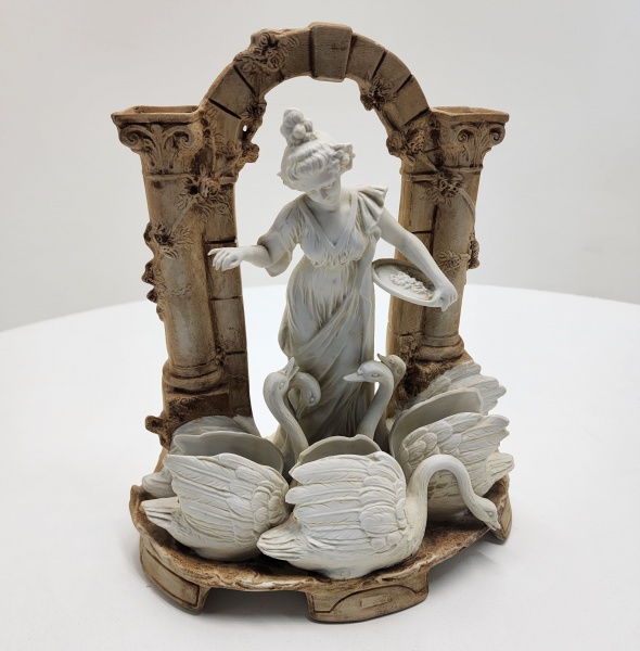 • Peça em porcelana italiano, séc. XIX. Escultura representando jovem alimentando cisnes, modelada em biscuit branco sobre base com colunas e arco em tom ocre, evocando ruínas clássicas. O grupo apresenta três cisnes em alto-relevo ao redor da figura central, composição típica da produção decorativa italiana do período. Marca pintada a ouro na base. Trabalho harmonioso, de linhas suaves e acabamento delicado. Dimensões: 26 xx21x12 centímetros.