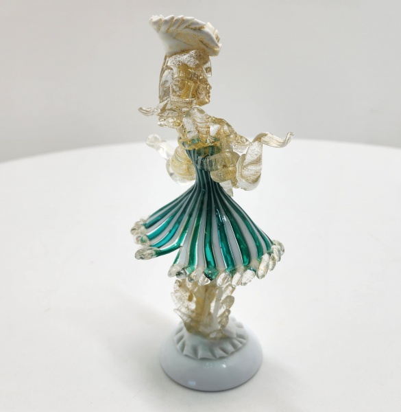• Escultura Pierrot em vidro artístico Murano, trabalhada à mão com aplicação de avventurina dourada no corpo e detalhes translúcidos em ouro-estrela. O personagem é modelado com o traje tradicional do Pierrot, exibindo saia em canas retorcidas verde-esmeralda e branco, típica das técnicas venezianas do século XX. A peça apresenta equilíbrio escultural, fluidez dos gestos e base em vidro opalino. Um trabalho decorativo de excelente efeito visual, representativo das oficinas de Murano da segunda metade do século XX. Dimensões: 21x10x8 centímetros.