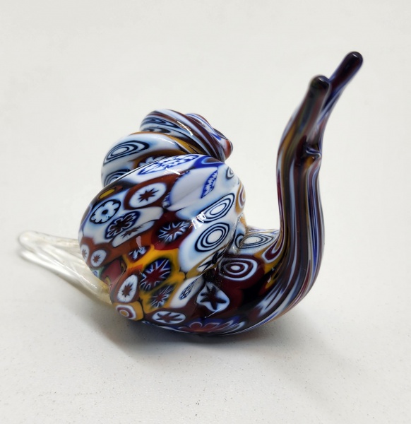 • Caracol em vidro artístico Murano trabalhado na técnica tradicional millefiori, evidenciado por sua concha formada por mosaicos multicoloridos em padrões circulares e espiralados. O corpo em vidro translúcido com leve aplicação de pó de ouro complementa a peça, realçando o contraste com a concha elaborada. Escultura inteiramente modelada à mão, apresentando forma fluida, acabamento polido e etiqueta de origem italiana na base. Peça decorativa de excelente presença e forte apelo colecionável, representativa do artesanato vítreo de Murano. Dimensões: 7x8x4 centímetros.
