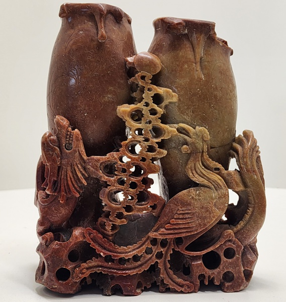 • Escultura chinesa talhada em pedra jaspeada, com belíssimo gradiente natural que varia do terracota ao âmbar esverdeado. A peça representa dois vasos baluster unidos sobre base orgânica perfurada, cercados por elaboradas figuras míticas esculpidas em alto-relevo. Na composição frontal, destaca-se o par simbólico Dragão e Fenghuang (Fênix Chinesa)  combinação considerada auspiciosa e associada à harmonia perfeita entre forças masculinas e femininas (Yang e Yin). O dragão, com corpo ondulante, escamas marcadas e cabeça expressiva, aparece em movimento ascendente. A fênix, com plumagem aberta em leque e cauda longa em volutas, surge em postura elegante e protetiva. Dimensões: 22x17x8 centímetros. Apresenta pequenos desgastes e perdas em pontas mais delicadas, comuns em esculturas de pedra.
