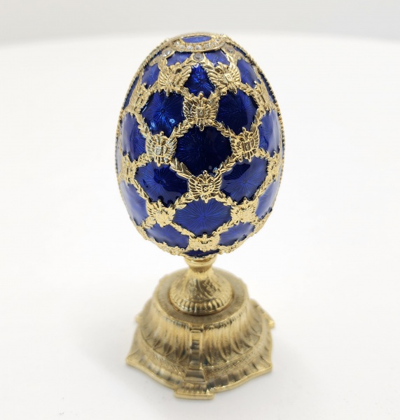 • Sofisticado ovo decorativo no estilo Fabergé, adquirido na Rússia e confeccionado em liga metálica banhada a ouro, com esmaltação translúcida em tom azul safira profundo. O acabamento guilloché sob o esmalte cria efeitos de luz característicos das peças inspiradas nos ovos imperiais produzidos para a corte dos Romanov. A superfície externa apresenta treliças douradas em relevo, com ornamentos florais e pequenos cristais decorativos, formando uma composição clássica do estilo Russo Imperial. Abertura articulada revela interior esmaltado em azul claro, com padrões florais em relevo. No centro, a peça traz duas surpresas tradicionais: Mini relógio funcional em estilo relógio de bolso, com tampa esmaltada. Mini coroa imperial cravejada, também banhada a ouro, decorada com cristais cintilantes.