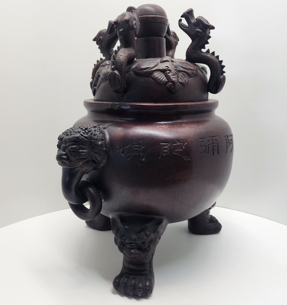 • Magnífico incensário chinês de grande porte, executado em cerâmica de alta temperatura com acabamento em tonalidade castanho-escura, imitando o aspecto do bronze tradicional. O corpo globular apresenta inscrições devocionais em chinês, associadas à proteção e purificação espiritual. As laterais são adornadas por imponentes cabeças de leões guardiões (Shi/Fu Lion) que funcionam como alças decorativas. A peça se apoia sobre três pés em forma de patas de leão, reforçando a simbologia protetiva ligada à cultura chinesa. A tampa, ricamente modelada, apresenta dragões ascendentes em alto-relevo, elementos ligados ao poder, prosperidade e energia vital. Dimensões: 60x53x40 centímetros.