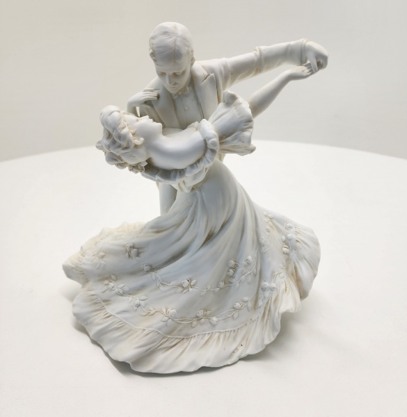 • Elegante escultura representando um casal em movimento de dança clássica, modelado em porcelana com acabamento fosco e delicado. A composição captura o instante de uma valsa, com o cavalheiro inclinando suavemente a dama, cuja saia esvoaçante apresenta ornamentos florais em relevo. Os detalhes do traje, gestos e fluidez do movimento conferem à peça uma estética romântica e atemporal, típica da arte decorativa europeia. Dimensões:23 x23 x14 centímetros.
