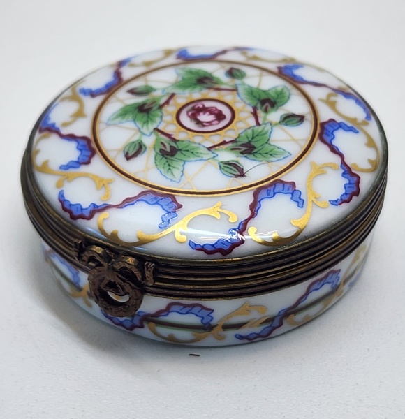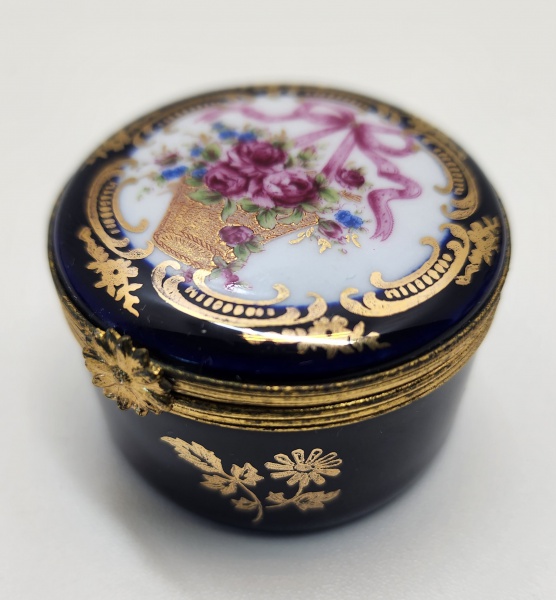 • Caixinha francesa Limoges, peça inteiramente pintada à mão. Modelo oval em porcelana fina, com corpo em azul profundo e tampa esmaltada em branco, decorada com flores em tom sépia-avermelhado e contornos dourados delicados. A peça apresenta acabamento em metal trabalhado e fecho frontal ornamentado, mantendo o estilo tradicional das caixas de Limoges. Dimensões: 3x4x6 centímetros.