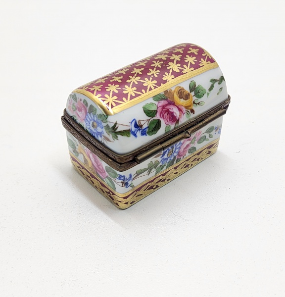 • Caixinha de porcelana Limoges, marcada no fundo, modelo em formato de baú, ricamente pintada à mão com flores em tons vibrantes e frisos em ouro. A tampa em tom vinho com detalhes dourados realça o brilho da peça, que ainda conta com fecho metálico em forma de coração e interior esmaltado com motivos florais. Dimensões: 4x5x4 centímetros.