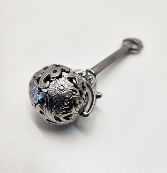 • Raro infusor europeu de chá em metal prateado, ricamente elaborado, final do sec. XIX ao início do XX. A peça apresenta uma esfera vazada em delicado trabalho floral repuxado, com ramagens e pétalas em alto relevo, criando um efeito ornamental típico da ourivesaria artística do período vitoriano. O cabo alongado, de perfil facetado, incorpora uma bela argola decorativa na extremidade, equilibrando estética e funcionalidade. Dimensões: 13x5 centímetros.