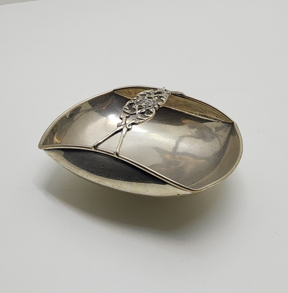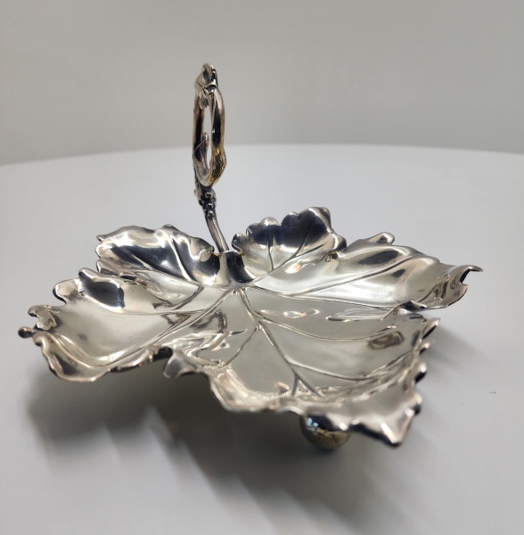 • Prato em prata de lei em forma de folha, Peça de prata portuguesa modelada em formato de folha com recortes sinuosos e pegador curvo em espiral, ornado com pequenos relevos naturalistas. Sustentada por três pés esféricos, apresenta excelente acabamento artesanal e brilho característico da prata de lei. O punção visível na haste. A forma e o estilo remetem ao gosto naturalista e decorativo da ourivesaria do período entre 1900 e 1930, comum em pequenas bandejas e peças de apoio de mesa produzidas em oficinas portuguesas. Dimensões:12 x 22 centímetros, Peso: 231 gramas.