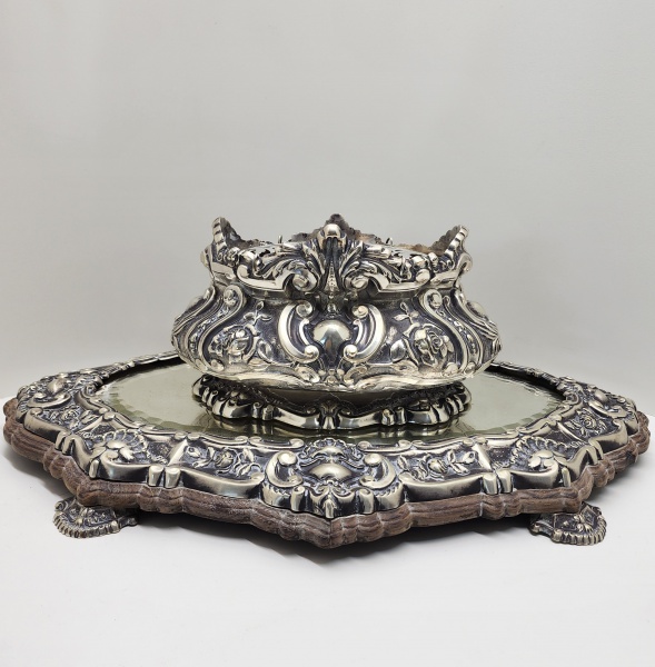 • Suntuosa floreira em prata brasileira de lei (900 milésimos), de corpo bojudo e exuberante decoração em relevo, com motivos de conchas, volutas e folhagens, dispostos em composição simétrica de inspiração barroca e rocaille. A peça repousa sobre base moldurada com espelho original, ricamente cinzelada e apoiada em pés ornados, formando um conjunto de notável presença decorativa e refinamento técnico. A execução revela a influência direta da ourivesaria portuguesa e francesa do século XIX, reinterpretada com maestria nas oficinas brasileiras da primeira metade do século XX. Apresenta punção PRATA 900, assegurando a autenticidade do metal e a elevada pureza da liga utilizada. Dimensões: 22 x 64 x 32 centímetros. Peso:6.457 kilos .