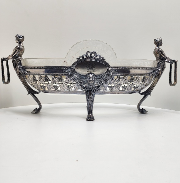 • WMF  Floreira em metal prateado com taça de cristal gravado  Alemanha, c. 1900Elegante e escultórica floreira da manufatura WMF (Württembergische Metallwarenfabrik), executada em metal prateado (marcação I/O), de corpo oval ricamente vazado e cinzelado com ornamentação de parreiras, guirlandas e mascarões clássicos. Apresenta nas extremidades figuras femininas em pé, em estilo neoclássico, sustentando argolas laterais  composição de refinado equilíbrio entre escultura e funcionalidade, típica das criações da WMF no período Jugendstil / Historicismo tardio. O conjunto é completado por taça interna em cristal gravado, com friso grego e borda recortada, original da manufatura. Marcada na base com o punção WMF e inscrição I/O, utilizados pela casa alemã entre c. 1890 e 1910, assegurando autenticidade e correspondendo à qualidade superior de galvanoplastia. Dimensões: 30 x 64 x 23 centímetros.