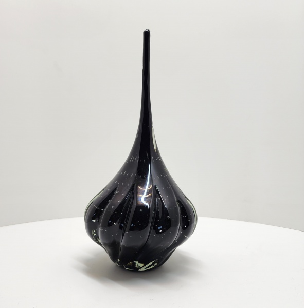 • Escultura em vidro artístico de Murano  Itália, século XX. Elegante escultura em vidro de Murano, de corpo sinuoso e alongado, executada em vidro negro translúcido com inclusão de bolhas regulares e delicado efeito espiralado. O trabalho revela a maestria dos mestres vidreiros de Murano, que, por meio do sopro livre e modelagem a quente, obtêm formas fluidas e equilíbrio entre peso, transparência e movimento. O design contemporâneo e a pureza da execução refletem a tradição artesanal veneziana reinterpretada ao longo do século XX. Dimensões aproximadas: 40 x 20 centímetros.