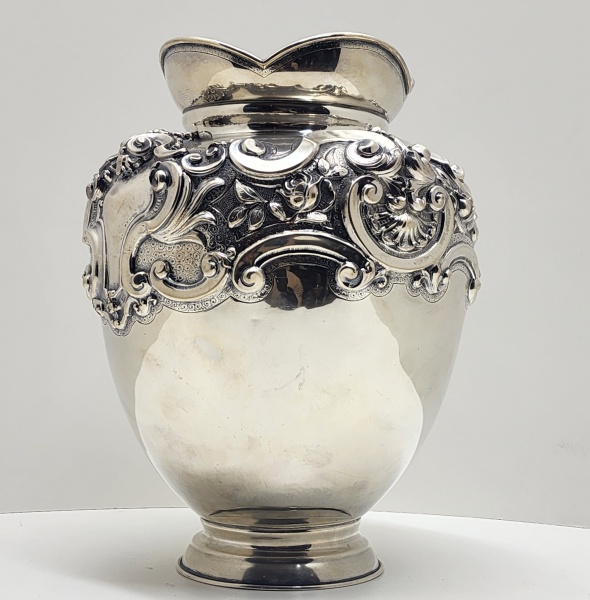 • Vaso em prata portuguesa de 1º título (916 milésimos), contraste da Águia  estilo Rococó, início do século XX. Elegante vaso em prata portuguesa contrastada com a marca da Águia, peça de corpo bojudo e pescoço ligeiramente expandido em borda recortada. A superfície é ricamente cinzelada e repuxada com ornamentação de inspiração rocaille, composta por volutas, flores e conchas em alto relevo, entre áreas lisas polidas que destacam o contraste entre brilho e textura. O trabalho revela grande domínio técnico na ourivesaria, evidenciado pelo refinado detalhamento das guirlandas florais e pelos fundos pontilhados (martelé fin)  acabamento típico das oficinas lisboetas e portuenses do início do século XX. Apresenta o punção português Águia voltada à direita (1º título, 916 milésimos), vigente entre 1887 e 1937, garantindo a autenticidade e a pureza da prata. Dimensões: 30 x 22 centímetros. Peso aproximado: 1,755 kilos.
