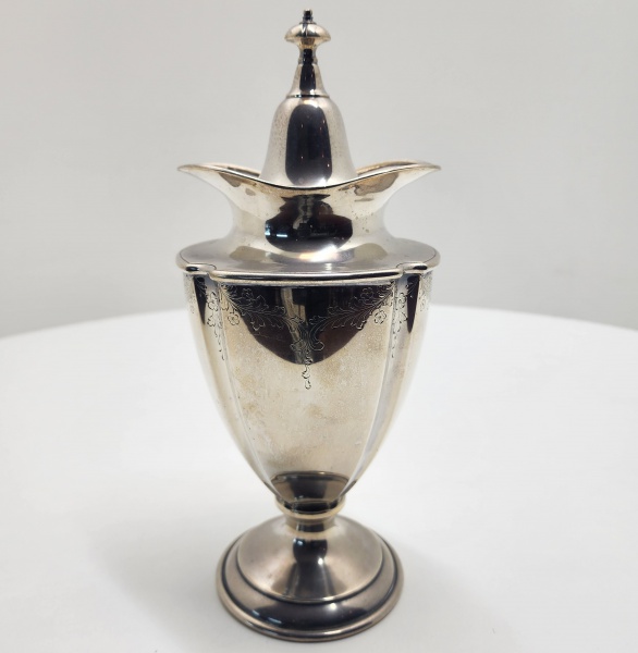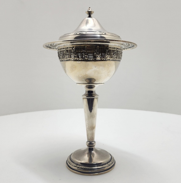 • Bombonière de apresentação em prata maciça (Sterling Silver .925), Gorham Silver Co., EUA, década de 1960  modelo nº 7964Elegante bombonière de apresentação em prata maciça (Sterling Silver .925), manufatura Gorham Silver Company, Providence, Rhode Island, Estados Unidos. De proporções esguias e harmonia clássica, apresenta haste elevada e base circular moldurada, sustentando corpo em forma de taça coberta. A borda superior é rendilhada (pierced work), com motivo geométrico refinado, e a tampa ajustada é rematada por pináculo cônico. O desenho alia pureza de linhas e equilíbrio formal, refletindo o estilo neoclássico reinterpretado pela ourivesaria americana do pós-guerra, período em que a Gorham alcançou o auge de sua produção de prata sólida. Marcada sob a base com o símbolo folhado da manufatura, a inscrição STERLING e o número de modelo 7964, indicando prata maciça de 925 milésimos. Dimensões: 34 x 17 gramas. Peso: 620 gramas.