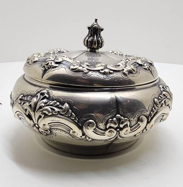 • Potiche em prata brasileira (833 milésimos), Ourivesaria União S. Br., São Paulo, c. 1940Imponente potiche com tampa, em prata brasileira de 833 milésimos, manufatura Ourivesaria União, São Paulo, cerca de 1940.De corpo bojudo e tampa ajustada com botão escultórico em forma de fruto estilizado, apresenta ornamentação repuxada e cinzelada em estilo Rococó revivalista, composta por volutas, concheados e motivos florais em relevo, delineados com extremo detalhamento artesanal. A peça exibe o equilíbrio característico da produção paulistana de meados do século XX, fundindo exuberância ornamental e refinamento técnico. Marcada sob a base com os punções UNIÃO S. BR. e PRATA 833, correspondentes à prata nacional de 2º título, amplamente utilizada nas oficinas de São Paulo nas décadas de 1930 e 1950.Dimensões: 13 x 17 centímetros. Peso: 485 gramas.