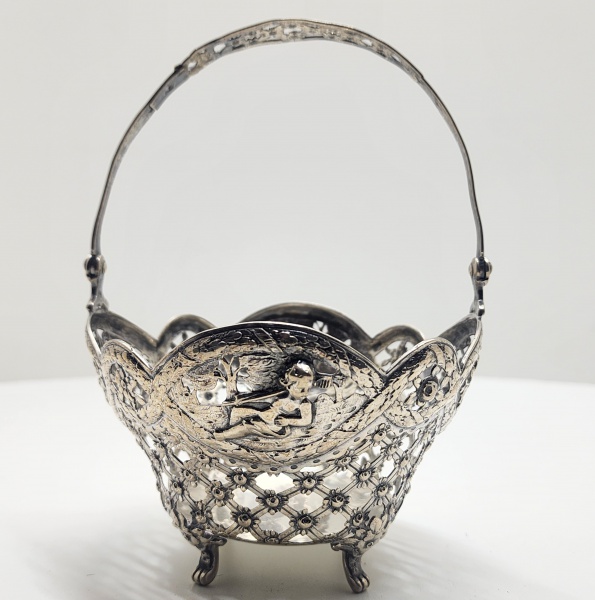 • Cestinho em prata portuguesa do início do séc. XX, Delicado cestinho em prata repuxada, cinzelada e vazada, de corpo quadrilobado apoiado sobre quatro pés recurvados e alça móvel superior com decoração rendilhada. As faces exibem painéis ovais repuxados em alto-relevo, representando cenas galantes com figuras em paisagem bucólica, enquadradas por molduras assimétricas de volutas, flores e entrelaçados geométricos  trabalho minucioso de cinzelagem, típico do gosto Rococó português. A peça revela a maestria dos ourives na transposição do repertório decorativo francês setecentista para a prata portuguesa de mesa e ornato. Dimensões: 25 x 14 centímetros. Peso: 437 gramas.