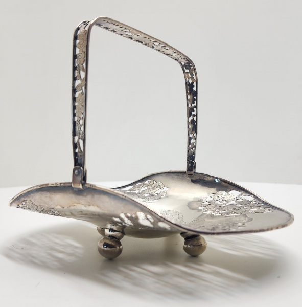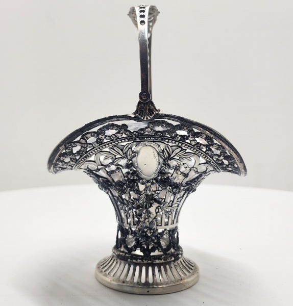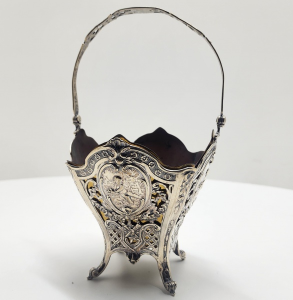 • Cestinho em prata vazada e cinzelada com cenas românticas, possivelmente europeia, séc. XIX. Delicado cestinho em prata de formato quadrilobado, sustentado por quatro pés recurvados e alça móvel superior vazada, com ornamentos florais e fitomórficos. As faces exibem painéis ovais em relevo, representando cenas galantes com figuras em paisagem bucólica, enquadradas por molduras de volutas e entrelaçados vazados de extremo detalhamento. A decoração, executada por repujado, cinzelado e recorte, é típica da estética Rococó europeia, inspirada nos motivos franceses do século XVIII  reinterpretada no século XIX por ourives de tradição germânica e inglesa. Dimensões: 18 x 13 centímetros. Peso: 228 gramas.