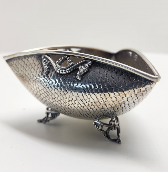 • Porta-confeito em prata de formato ovalado, finamente cinzelado em delicado padrão escamado, conferindo textura e luminosidade à peça. A borda superior é realçada por aplicações em relevo com volutas e arabescos simétricos, que acentuam o caráter decorativo e o equilíbrio formal do conjunto. A peça repousa sobre três pés elegantemente rendilhados, de desenho sinuoso e acabamento minucioso, que reforçam a leveza e sofisticação do modelo. O contraste entre as áreas polidas e a pátina escurecida realça a profundidade do trabalho artesanal. Peça de grande refinamento estético, ideal para compor ambientes clássicos ou coleções de prataria artística. Dimensões: 7 x 13 centímetros. Peso: 137 gramas.
