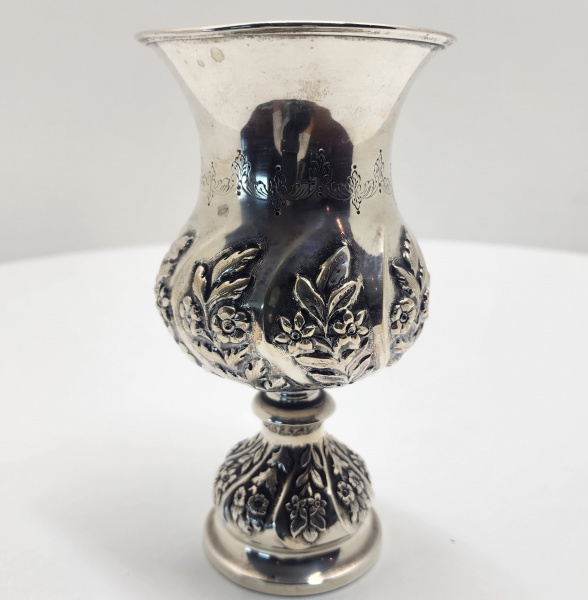 • Taça em prata portuguesa contrastada com a marca 833.Belíssima taça de corpo bojudo, ricamente repuxado e cinzelado com decoração de ramos e flores em relevo, sobre base circular ornamentada. Apresenta friso gravado com guirlandas e arabescos na parte superior. Trabalho português, prata de lei (833 milésimos), de estilo neobarroco, datado da segunda metade do século XX. Dimensões: 19x 11 centímetros. Peso: 246 gramas.