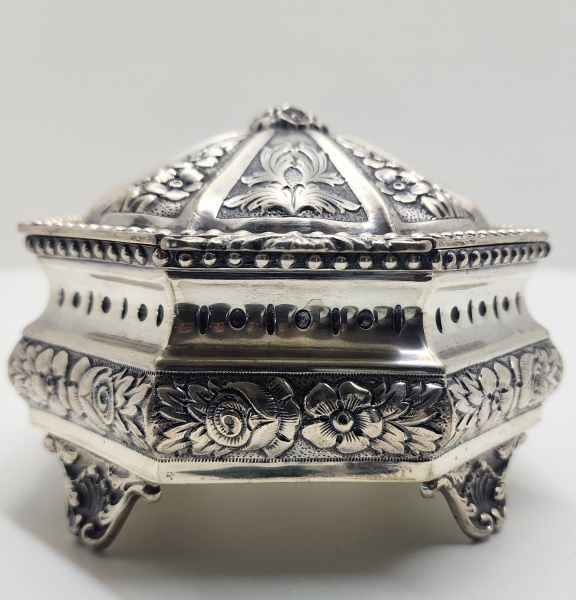 • Caixa octogonal em prata ricamente trabalhada, séc. XIX / XX.Peça de ourivesaria de formato octogonal, tampa abaulada articulada e corpo apoiado sobre quatro pés ornados. Toda a superfície apresenta delicado trabalho repuxado e cinzelado com flores, volutas e folhagens, compondo um conjunto de grande riqueza decorativa e equilíbrio formal. De provável produção europeia (possivelmente portuguesa), esta peça representa o refinamento técnico e estético da ourivesaria neobarroca.Dimensões:10 x 15 centímetros. Peso:314 gramas.