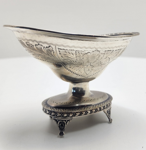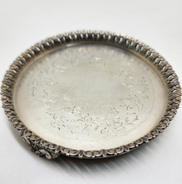 • Salva em prata brasileira, marca I.G., teor 835, meados do século XX. Salva circular em prata de lei com borda recortada e rendilhada, apoiada sobre três pés ornados por folhas de acanto. Centro gravado com decoração floral e arabescos de fino traço. Punções PRATA, IG e 835 gravados na base, correspondentes à oficina brasileira ativa na metade do século XX. Diâmetro:14 centímetros. Peso: 189 gramas.