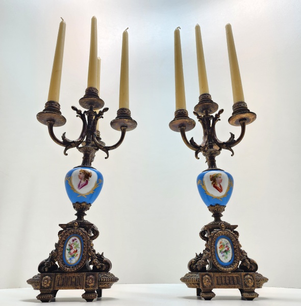 • Par de candelabros em porcelana Sèvres e bronze dourado, França, séc. XIX Magnífico par de candelabros franceses em porcelana Sèvres, no clássico tom bleu céleste, com montagens em bronze dourado ricamente cinzelado. Cada peça apresenta corpo em porcelana com medalhões pintados à mão, representando delicados retratos femininos ao gosto do século XVIII, emoldurados por guirlandas e arabescos dourados. A base, igualmente adornada, ostenta cartelas ovais florais em esmalte policromado, e sustenta estrutura de quatro braços sinuosos para velas, com minucioso trabalho de fundição e acabamento. Dimensões: 45 x 17 centímetros sem velas.