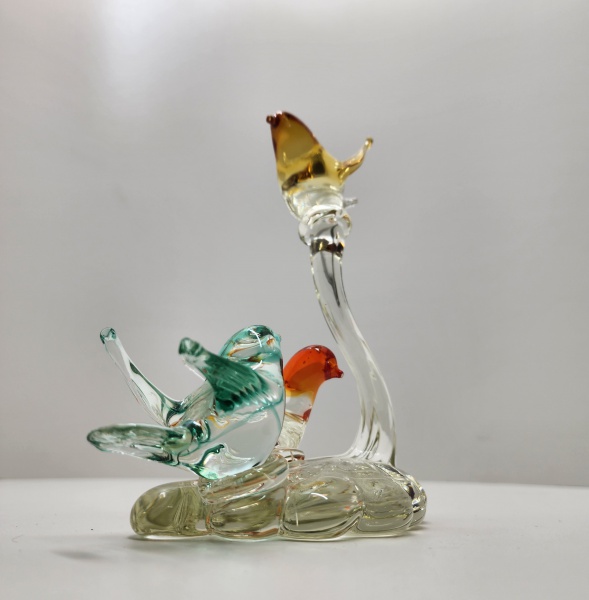 • Escultura em vidro artístico Murano, pássaros multicoloridos. Delicada escultura em vidro artístico de Murano, representando três pássaros pousados em base orgânica translúcida. As figuras, modeladas manualmente, exibem elegantes nuances em tons de âmbar, verde-água e vermelho alaranjado, com perfeita transparência e movimento fluido característico do vidro soprado veneziano. Altura:   20 x 18 x 13 centímetros.