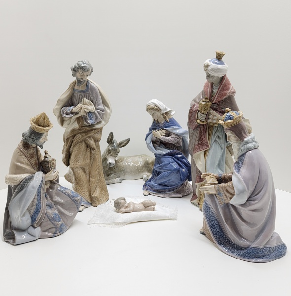 • Presépio completo em porcelana Ladró, Espanha Conjunto em porcelana artística Ladró, representando o nascimento de Cristo com delicadeza e expressão emocional inconfundíveis. Composto por sete figuras  o Menino Jesus, Maria, José, os Três Reis Magos e o jumento  o grupo revela o traço característico da manufatura espanhola: modelagem refinada, gestos suaves e paleta em tons pastel e azulados, de luminosidade serena. A perfeição nos detalhes dos rostos, vestes e adereços demonstra a excelência técnica e o inconfundível estilo Ladró, símbolo da porcelana artística do século XX. Manufatura: Ladró, Espanha Material: porcelana esmaltada policromada. Dimensões: menino Jesus 5 x 2 centímetros, são José 35 x 12 x 15 centímetros, Nossa Senhora 25 x 15 x 14 centímetros,  rei mago. 25 x 16 x 14 centímetros, rei mago. 26 x 14 x 15 centímetros, rei mago 35 x 12 x 14 centímetros. (Apresenta algumas pequenas perdas como mostram as imagens).