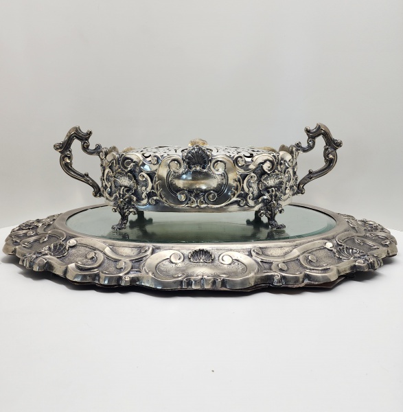 • Centro de mesa em prata portuguesa 833  trabalho de ourivesaria barroca. Imponente centro de mesa em prata portuguesa de lei (833 milésimos), composto por base espelhada de moldura profusamente cinzelada e corpo central vazado, com alças laterais em volutas e pés ricamente ornamentados. A decoração apresenta elaborado repertório de inspiração barroca, com conchas, volutas e motivos vegetalistas em composição simétrica, revelando o requinte e o virtuosismo técnico característicos da ourivesaria portuguesa de finais do século XIX e início do XX.O conjunto é marcado pela riqueza do cinzelado e pelo equilíbrio entre o volume escultórico e a leveza do trabalho vazado, resultando em uma peça de forte presença decorativa e excepcional execução artesanal. Apresenta punção da águia portuguesa, correspondente à prata 833, e contraste adicional de oficina, assegurando sua autenticidade e origem nacional. Dimensões: 20 x 70 x 54 centímetros, Peso total: 7.393 kilos.