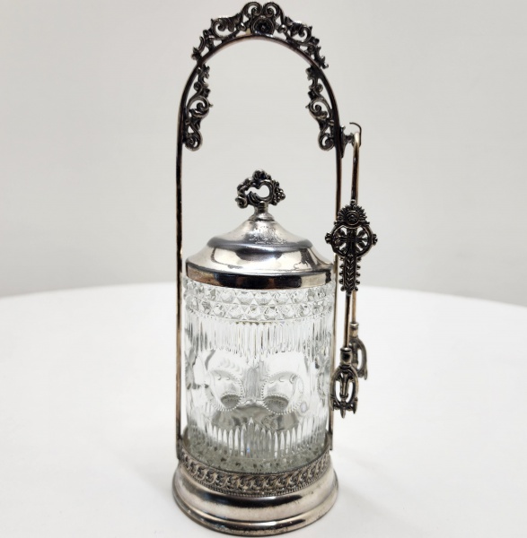 • Pickle Castor em vidro moldado e metal prateado  Europa, fim do século XIX. Charmoso pickle castor (compoteira com suporte) composto por recipiente em vidro moldado transparente, com decoração em relevo de faixas verticais e reservas florais, acompanhado de tampa e estrutura em metal prateado finamente trabalhada com motivos florais e rocalhas. O conjunto é sustentado por arco decorativo em estilo vitoriano, com ornamentação vegetalista e suporte lateral para pinça metálica, de fino acabamento. A peça reflete o gosto e a sofisticação das criações domésticas europeias do final do século XIX, quando a mesa passou a incorporar objetos artísticos de uso cotidiano, aliando praticidade e ornamentação refinada. Dimensõe:26x9 centímetros.