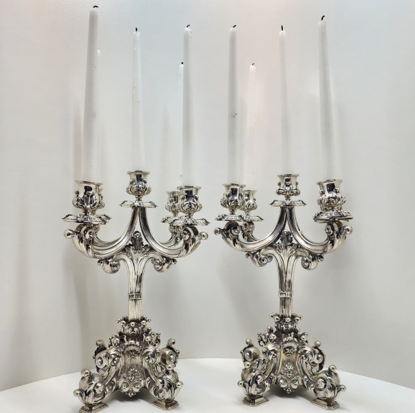 • Par de candelabros em prata austro-húngara  Boêmia, c. 1880 a 1910. Marcados com o contraste da cabeça de Diana. Magnífico par de candelabros em prata de lei, cada um com cinco luzes, dispostas em braços sinuosos e profusamente cinzelados, partindo de um fuste central ornamentado. A decoração apresenta exuberantes motivos e folhagens em relevo, alternando volutas, conchas e elementos florais, apoiados sobre bases tripartidas com pés em enrolamentos simétricos, em composição de clara inspiração Rococó. O conjunto reflete o refinamento técnico e o requinte ornamental da ourivesaria austro-húngara do final do século XIX, especialmente das oficinas da Boêmia (atual República Tcheca), conhecidas pela excelência no trabalho em prata e pela fusão entre a tradição barroca e o gosto decorativo centro-europeu. Apresentam o contraste oficial da cabeça de Diana, certificando a origem e autenticidade dentro do sistema de contrastes do Império Austro-Húngaro (1867 a 1922). Dimensões: 40 x 27 centímetros. Peso: 4,506 kilos.