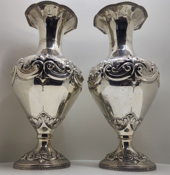 • Par monumental de vasos em prata de lei portuguesa 925 estilo Rococó, início do século XX. Com contraste Águia (Portugal, 1º título, 1887 a 1937). Imponente par de vasos em prata portuguesa, com corpo bojudo, pescoço alongado e borda superior recortada em movimento ondulante. As superfícies são profusamente cinzeladas com motivos rocaille, volutas, conchas e folhagens estilizadas em relevo, integradas por frisos perlados e ornatos gravados. A base e o bojo apresentam decoração simétrica e volumetria equilibrada, expressando a estética exuberante do estilo Rococó, da ourivesaria portuguesa. Apresentam o punção oficial português da Águia (1º título), utilizado entre 1887 e 1937, certificando prata de teor 925, acompanhado de contraste de oficina, assegurando origem e autenticidade. Dimensões: 58 x 26 centímetros cada. Peso: 5,458 kilos.