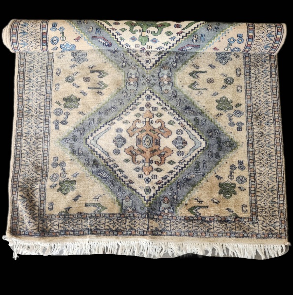 • Elegante tapete paquistanês Karachi, tecido à mão em lã sobre base de algodão, caracterizado por sua composição clássica em três medalhões centrais losangulares, emoldurados por uma borda ornamental de inspiração floral e geométrica. A paleta suave combina tonalidades de bege, verde, azul e acentos terrosos, conferindo à peça um aspecto tradicional e harmonioso.  (Apresenta alguns desgastes). Dimensões: 1,60x0,93.