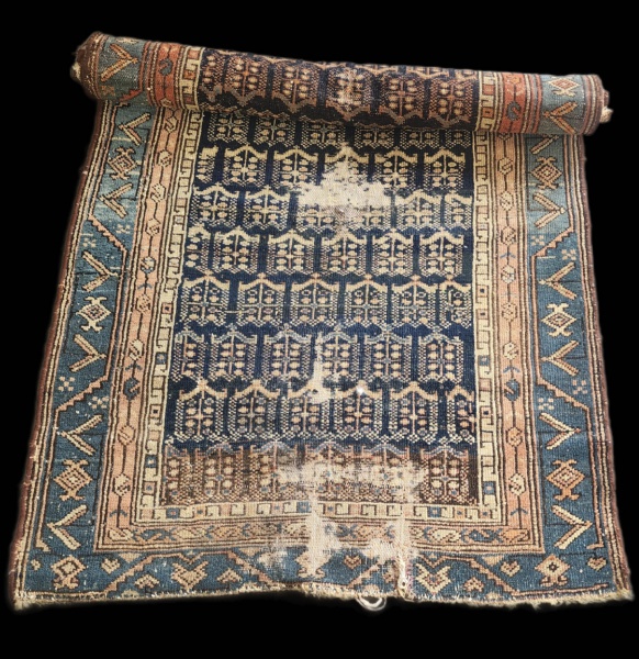 • Raro tapete persa Karabagh, originário da região do Cáucaso Meridional, conhecido por suas composições gráficas e padrões repetitivos inspirados em motivos tribais. A peça apresenta um campo decorado por módulos geométricos em repetição, emoldurados por uma borda de inspiração caucasiana com motivos angulares em tons de azul petróleo, terracota, bege e marfim. Tecida à mão em lã sobre urdume de algodão, a obra demonstra características tradicionais dos Karabagh mais antigos: paleta profunda, desenhos densamente distribuídos e estrutura firme. A peça apresenta desgaste acentuado ao centro e nas extremidades, com áreas de perda de nós visíveis, especialmente na parte inferior, onde o urdume está exposto. As bordas apresentam fragilidade e perda parcial. Dimensões:2,46x0,88