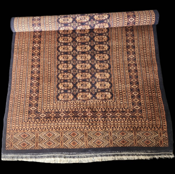 • Imponente tapete paquistanês Karachi, elaborado com o tradicional desenho Bokhara, caracterizado pela repetição de fileiras de guls (motivos ovais tribais) ao longo de todo o campo central. A peça apresenta uma paleta sofisticada composta por tons de castanho, ferrugem, marfim e azul profundo, que reforçam a harmonia e o equilíbrio visual. Tecida à mão em lã sobre urdume de algodão, a tapeçaria demonstra excelente regularidade de nós e refinamento clássico da produção paquistanesa, com bordas múltiplas ricamente ornamentadas por padrões geométricos finamente executados. O tapete mantém boa integridade estrutural, com franjas preservadas e leve desgaste natural compatível com seu uso, sem prejuízo estético relevante. Dimensões: 2,07x1,34.