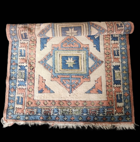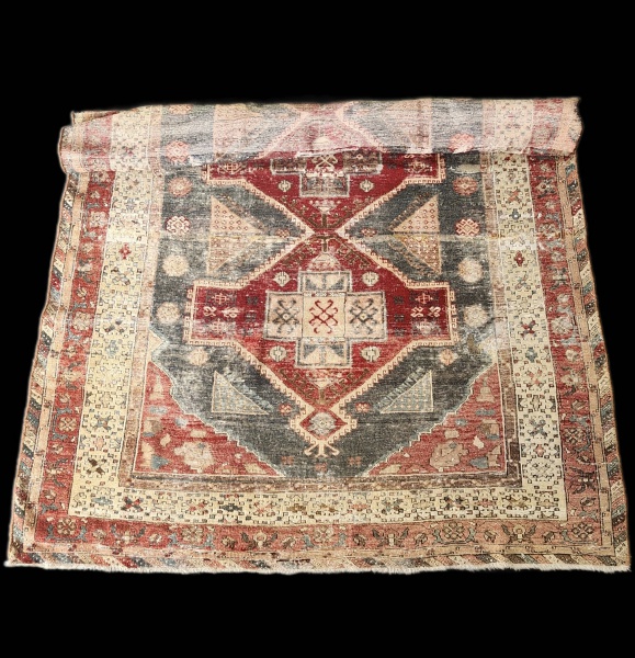 • Imponente tapete Kazak turco, reconhecido por sua estética tribal geométrica e pela forte presença visual dos seus grandes medalhões centrais escalonados, típicos das tecelagens do leste da Anatólia. A peça apresenta três medalhões interligados em tons de vermelho profundo, azul petróleo e cinza, com elementos simbólicos como cruzes estilizadas, ganchos, estrelas e formas angulares, todos característicos da iconografia Kazak. A paleta desbotada pelo tempo  com nuances de marfim e terracota  reforça seu caráter autêntico e artesanal.A borda múltipla combina padrões geométricos repetitivos, criando um enquadramento forte e harmonioso. Tecida à mão em lã sobre urdume de algodão, a peça mantém as proporções e o estilo robusto que diferenciam os Kazak turcos de outras tradições caucasianas. Apresenta desgaste natural e variações de cor compatíveis com sua idade, preservando, porém, a estrutura e a leitura do desenho. Dimensões: 2,94x1,66