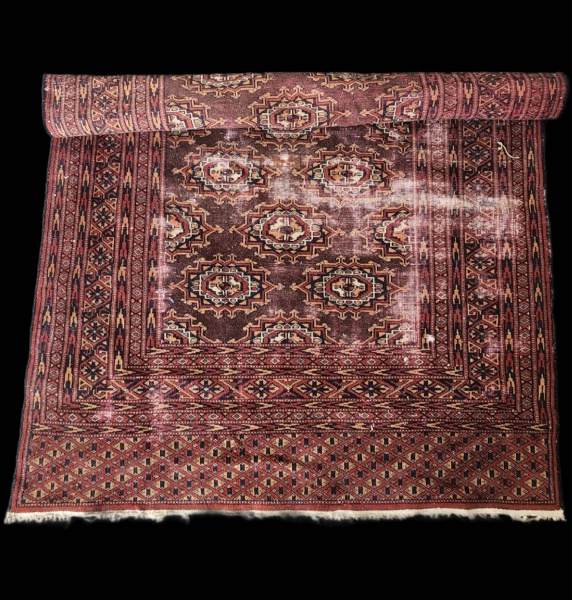 • tapete oriental do tipo Karachi, produzido no Paquistão, apresentando o clássico conjunto de motivos geométricos repetitivos, distribuídos de maneira equilibrada ao longo do campo central. O desenho é composto por medalhões estilizados de influência tribal, com contornos angulares e simétricos. A paleta cromática combina tons de vinho, castanho, bege, azul escuro e acentos creme, criando uma atmosfera quente e elegante  característica marcante dos Karachi de produção tradicional. A borda múltipla exibe pequenos padrões geométricos interligados, acrescentando profundidade e sofisticação ao conjunto. Tecida à mão em lã sobre urdume de algodão, a peça evidencia a técnica refinada dos ateliês paquistaneses, com nós regulares e composição bem estruturada. Apresenta desgaste natural em algumas áreas, sem prejuízo relevante à leitura do desenho. Dimensões: 287x1,25