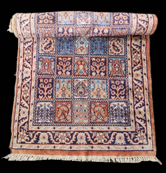 • Passadeira indiana Kashmiri, executado inteiramente à mão, trabalho em seda sobre seda. Peça de formato runner, apresentando composição em lajotas geométricas com motivos florais estilizados, arabescos e elementos tradicionais da escola têxtil de Kashmir. A paleta alterna azuis, ocres, telhas e marfim, com excelente definição de desenho, característica dos finos teares de seda. Bordas múltiplas com friso floral contínuo e franjas originais preservadas.Trabalho de alta delicadeza, típico da produção artesanal do norte da Índia. Apresenta leve desbotamento da cor natural do tempo.  Dimensões: 3,07x0,91.