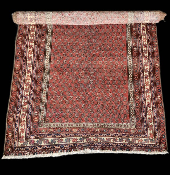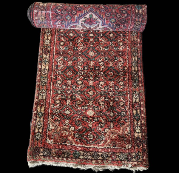 • Tapete persa Ferahan, trabalho artesanal em lã sobre algodão.A peça apresenta campo vermelho integralmente preenchido por motivo Herati/Fish miúdo, repetido de forma precisa e típica da tradição antiga de Ferahan. Cercadura múltipla com faixas estreitas geométricas e friso principal em fundo marfim, marcado por desenhos angulares e elementos foliares em azul-marinho, verde e vermelho, características distintivas dos teares da região. Exemplar de composição clássica, com paleta quente e desenho de grande regularidade, representativo dos tapetes Ferahan tradicionais, valorizados pelo detalhe minucioso e equilíbrio ornamental. Apresenta alguns desgaste natural do tempo.  Dimensões: 2,80x1,42.