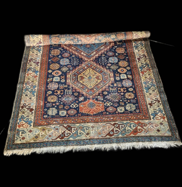 • Belo exemplar de tapete caucasiano Shirvan (Chirvan), execução manual em lã sobre algodão.Exemplar de forte caráter tribal, apresentando três medalhões geométricos centrais em azul, amarelo e vermelho, dispostos sobre campo azul-noite densamente preenchido por rosetas, elementos angulares, pequenos animais e motivos simbólicos típicos do leste do Cáucaso. A cercadura múltipla reúne frisos geométricos estreitos e borda principal em fundo marfim, decorada por motivos em S e ganchos caucasianos, em paleta vibrante de azuis, laranjas e terracotas. Peça de desenho vigoroso e excelente leitura cromática, com áreas pontuais de desgaste na extremidade inferior, sem comprometer a integridade geral nem o valor decorativo e etnográfico. Apresenta desgaste natural do tempo.  Dimensões:3,20x1,96.