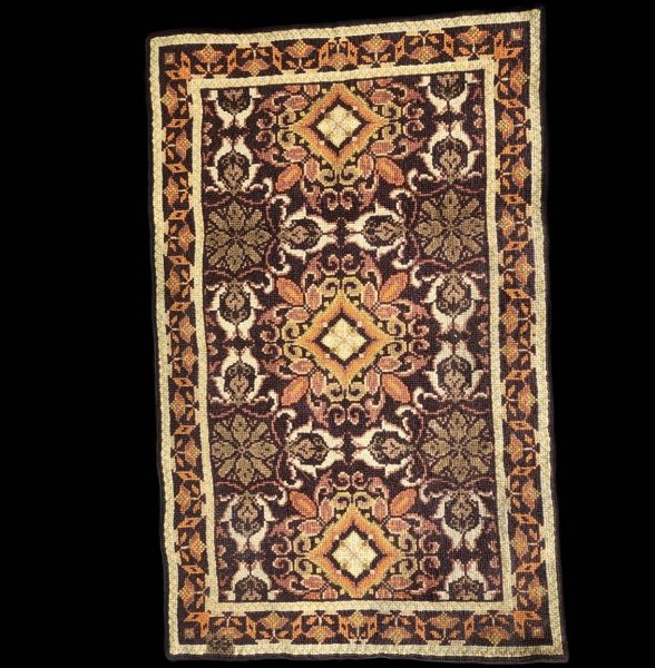 • Tapeçaria Casa Caiada intitulada Flor dos Montes, execução artesanal em lã sobre base têxtil, datada de 1979.A composição apresenta desenho geométrico-floral simétrico, característico da produção da Casa Caiada, com paleta quente em tons de marrom, ocre, âmbar e laranja. O motivo central se repete em módulos equilibrados, enquadrados por cercadura decorada com friso de folhagens estilizadas. No verso, inscrição original Flor dos Montes  1979, identificando título e procedência da peça. Dimensões: 1,25x0,80
