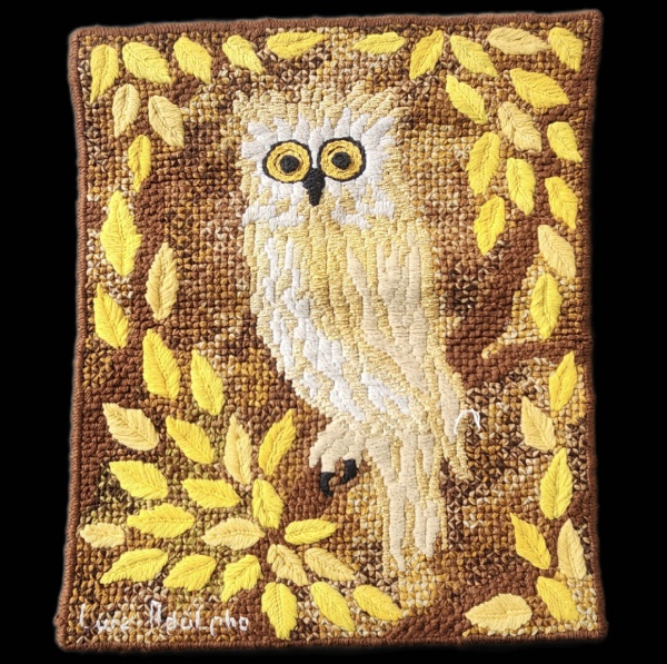 • Tapeçaria brasileira assinada Luiz Adolpho, execução artesanal em lã sobre base têxtil, representando uma coruja.A obra apresenta composição figurativa com coruja central em destaque, modelada em pontos altos e baixos que conferem volume ao corpo da ave e expressividade ao olhar. O fundo, trabalhado em tons terrosos, é decorado por folhas estilizadas em amarelo e ocre, criando moldura orgânica ao redor da figura principal. A paleta quente enfatiza a leitura decorativa e o caráter artesanal da peça.No verso, inscrição manuscrita com nome do artista, reforçando procedência e autenticidade.Trabalho representativo do artesanato têxtil figurativo brasileiro da segunda metade do século XX. Dimensões: 60x50 centímetros.