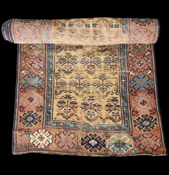 • Tapete caucasiano Mesquim (Meshkin), execução manual em lã sobre lã, no formato runner.A peça apresenta campo central estreito em tom ocre-amarelado, ornado por sequência vertical de ramos florais estilizados, característicos da produção tribal da região. As largas faixas laterais exibem medalhões geométricos florais em azul, verde, terracota e marfim, criando contraste cromático marcante e reforçando a estética típica dos teares caucasianos. A cercadura múltipla, formada por frisos geométricos em azul e marrom, enquadra o conjunto com equilíbrio e ritmo visual.Exemplar de forte identidade etnográfica, com desgaste compatível à idade, preservando ainda a integridade decorativa e o desenho tradicional caucasiano. Apresenta desgaste natural do tempo.  Dimensões: 3,28x0,82 centímetros.